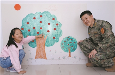 在張威偉家的墻上,畫著一棵蘋果樹。不知從哪天起,蘋果樹旁又“長”出一棵小蘋果樹。女兒說,爸爸表現好,她就用紅紙剪一個蘋果貼在上面;表現不好,蘋果樹上就會長出藍色的蘋果。