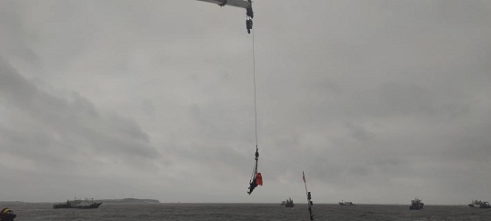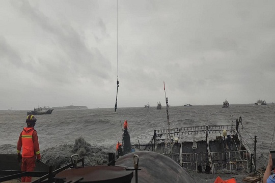 9月16日,山東威海海警局接到報(bào)警稱,一艘漁船在榮成市神飛造船廠附近海域發(fā)生船舶傾覆,兩名群眾被困,受臺風(fēng)“梅花”影響,事發(fā)海域風(fēng)力達(dá)7級以上,浪高3-5米,情況十分危急。海警執(zhí)法員第一時(shí)間趕赴現(xiàn)場,并對接相關(guān)部門聯(lián)合行動。海警執(zhí)法員不斷向被困群眾喊話安撫情緒,并采取吊車起吊的方式實(shí)施救援。經(jīng)過近一個(gè)小時(shí)的努力,兩名群眾安全脫困,目前身體狀況良好。