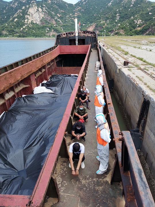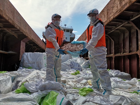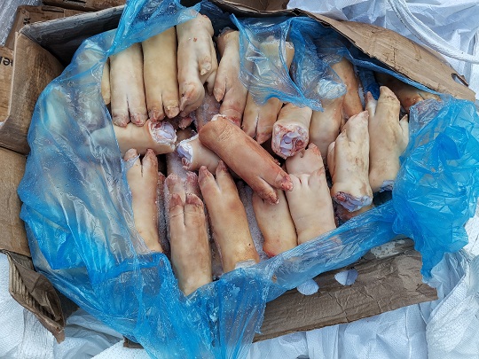 當日上午8時許,廣東海警局接群眾舉報,在廣東江門臺山市烏豬島對開海域有人進行涉嫌走私活動。該局立即指派廣東江門海警局執(zhí)法艇前往目標海域進行查緝。9時30分許,執(zhí)法員在目標海域成功攔截該艘目標船舶,經登臨檢查發(fā)現,船上共有5人,船艙內裝有大量白色塑料袋,袋內紙箱裝有豬肚、豬蹄、牛肚等凍品約130噸,船上人員均無法提供該批凍品的合法來源及檢驗檢疫證明,涉嫌走私。
