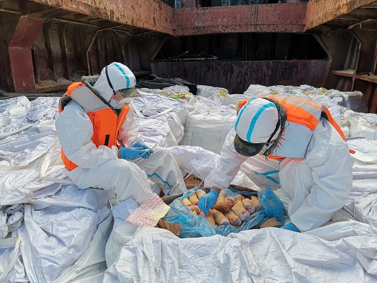 圖為海警執(zhí)法員對凍品進行檢查。