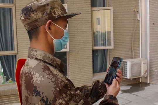 圖為預(yù)定新兵小朱撥打視頻電話與法院唐庭長(zhǎng)進(jìn)行交流。