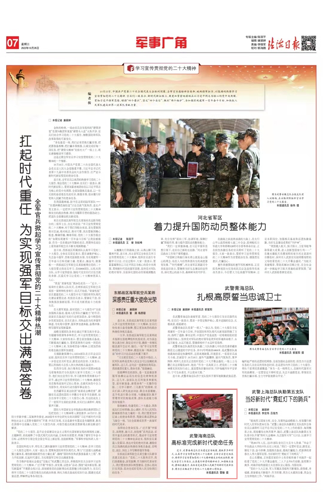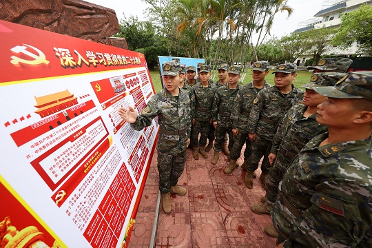 近日,武警海南總隊官兵通過宣傳板報、報紙等多種形式,認真學(xué)習(xí)宣傳貫徹黨的二十大精神。全體官兵堅定地表示,要將學(xué)習(xí)宣傳貫徹黨的二十大精神煥發(fā)出的政治熱情,轉(zhuǎn)化為堅守工作崗位、認真履行職責(zé)的精神動力,加強練兵備戰(zhàn)、磨礪打贏能力,高標準完成黨和人民賦予的新時代使命任務(wù)。