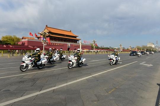 圖為國賓護衛(wèi)隊護衛(wèi)外賓駛過天安門。石玉濤 攝