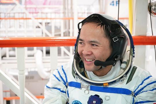 圖為費(fèi)俊龍?jiān)谀M艙內(nèi)。