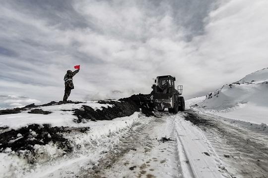 圖為武警第二機(jī)動(dòng)總隊(duì)某支隊(duì)養(yǎng)護(hù)十七中隊(duì)官兵在海拔4658米的業(yè)拉山上執(zhí)行冬季清雪除冰任務(wù)。本報(bào)通訊員李貴華 攝