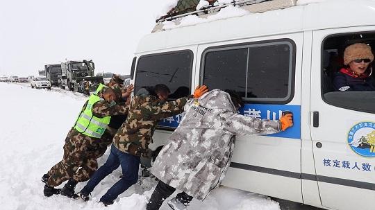 每年11月至次年4月,養(yǎng)護(hù)路段平均積雪深20厘米,暗冰也有10厘米厚。2021年4月,連夜降雪導(dǎo)致一臺(tái)電建部門(mén)的車輛陷入邊溝,亟待救援。