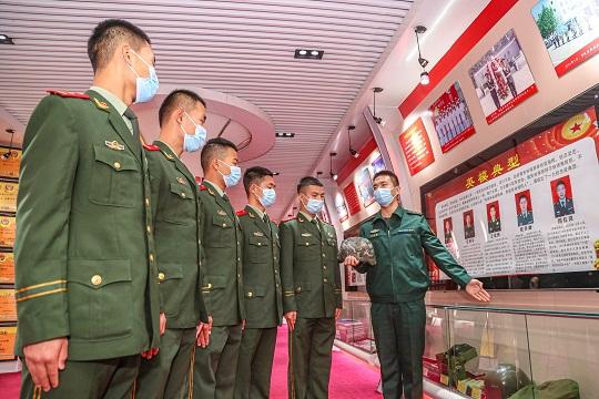 “新時(shí)代黨和國(guó)家取得的偉大成就,在于有以習(xí)近平同志為核心的黨中央掌舵領(lǐng)航,在于有習(xí)近平新時(shí)代中國(guó)特色社會(huì)主義思想指引航向;國(guó)防和軍隊(duì)現(xiàn)代化建設(shè)取得的偉大成就,根本在于黨旗光輝的永恒照耀,在于有習(xí)近平強(qiáng)軍思想的科學(xué)指引?!眹?guó)賓護(hù)衛(wèi)中隊(duì)榮譽(yù)室內(nèi),政治指導(dǎo)員劉赫結(jié)合隊(duì)史,與官兵交流學(xué)習(xí)黨的二十大報(bào)告體會(huì)。