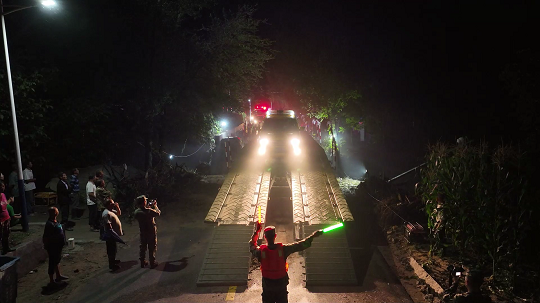 “我們從來沒有在這種環(huán)境下架過橋?!蓖跣裾f,架設(shè)時,上方的電線距離車輛僅有30公分,周邊有樹木遮擋阻礙視線。而且,作業(yè)區(qū)域的寬度只有6米多。