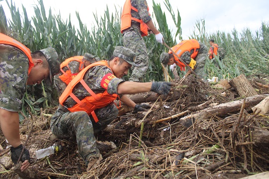 圖為武警吉林總隊吉林支隊官兵對珠琦河沿岸匯聚的沉積物下方進行重點搜尋。