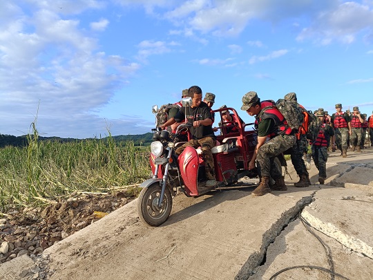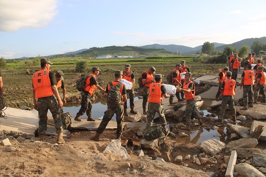 圖為武警吉林總隊吉林支隊官兵用人橋代替石橋接力搬運救災物資。