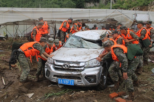 圖為武警吉林總隊吉林支隊官兵合力推行車輛,轉移被困群眾。