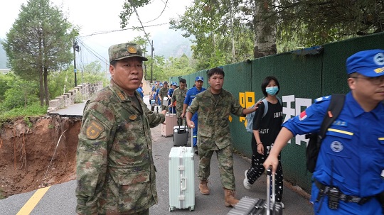轉(zhuǎn)運(yùn)現(xiàn)場,救援人員逐一清點(diǎn)人數(shù),幫助學(xué)生們整理好行李,有序組織轉(zhuǎn)運(yùn)。遇到斷橋,救援人員搭建起簡易扶梯,協(xié)力攙扶學(xué)生,將他們逐一送至岸邊安全地域。遇到?jīng)_毀路段,救援人員組成人墻將孩子們護(hù)在崖壁內(nèi)側(cè),迅速通過,直至將他們安全送至鎮(zhèn)上的大巴車上。