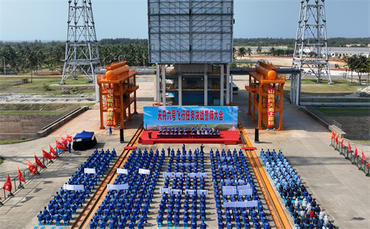 在文昌航天發(fā)射場,每次發(fā)射前都有一項特殊的“出征儀式”——火箭垂直轉(zhuǎn)運。航天人深情凝望火箭活動發(fā)射平臺上的鮮紅國旗和動員標(biāo)語,揮舞黨旗、唱響紅歌、誓師動員……這項特殊的儀式,見證著祖國航天事業(yè)的騰飛,也為重大航天發(fā)射任務(wù)注入不竭的精神動力。