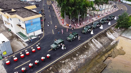 “愛意翻山渡海,終抵良人身畔。今天我們在此,和天空,和海疆,和艦艇一起見證這11對新人人生最重要的時刻?!彪S著愛情的煙花在天空綻放,幸福的汽笛在海疆長鳴,熱烈的鑼鼓在廊道敲響,11對新人在親友和來賓的祝福中從海警艦艇緩步走向“情定粵港灣·愛上這片?!奔w婚禮的舞臺。