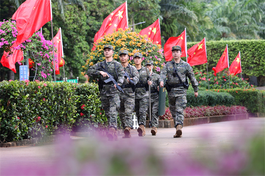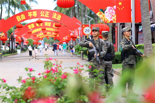 9月30日,國(guó)慶中秋“雙節(jié)”放假期間,擔(dān)負(fù)城市武裝巡邏任務(wù)的武警海南總隊(duì)??谥ш?duì)官兵始終堅(jiān)守在執(zhí)勤一線,他們?cè)谏倘Α⒐珗@、城市主干道等重點(diǎn)部位巡邏警戒,確保駐地安全穩(wěn)定。