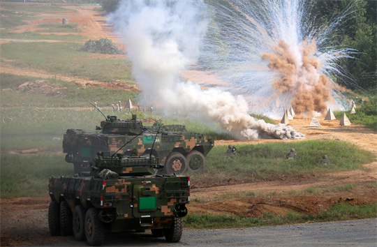 圖為第74集團軍某旅“生死在一起連”在實兵戰(zhàn)術演練中,裝甲車快速通過通路。
