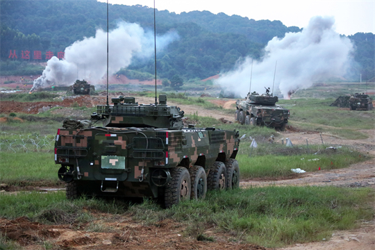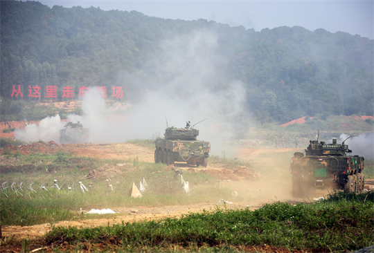 圖為第74集團軍某旅“生死在一起連”開展實兵戰(zhàn)術演練,連隊戰(zhàn)車占領前沿陣地。