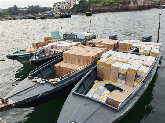 經(jīng)檢查,5艘涉案摩托艇及所載貨物均無(wú)合法手續(xù)及相關(guān)證明,涉嫌走私。經(jīng)清點(diǎn),該5批貨物共有中華、荷花、芙蓉王、黃鶴樓、紅雙喜等20余類(lèi)品牌香煙1.2萬(wàn)余條,案值約460萬(wàn)元。