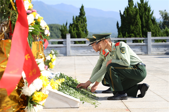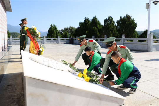 圖為武警官兵與駐地學(xué)生向革命先烈獻花。