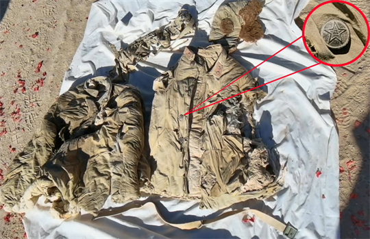 專業(yè)人員在對遺骸一帶進行深度勘查挖掘時,又發(fā)現(xiàn)一些子彈袋、老式解放鞋、軍衣軍帽等舊式軍用品和部分散落骸骨。其中,兩具遺骸較為完整,部分衣扣上鑄有清晰的“八一”字樣,衣領(lǐng)上還有紅色領(lǐng)章,一條破碎的舊毛巾上印有依稀可見的“軍用品”三個字。