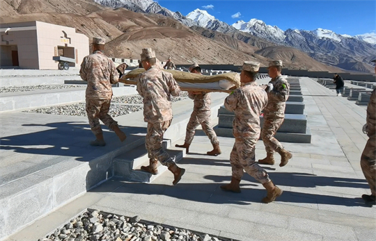 近日,新疆維吾爾自治區(qū)軍地檢察機關(guān)和退役軍人事務部門相關(guān)人員來到康西瓦烈士陵園,共同迎接“失散”多年的英烈遺骸“歸隊”,8名邊防官兵邁著穩(wěn)重的步伐,輕輕將遺骸放入墓穴中。