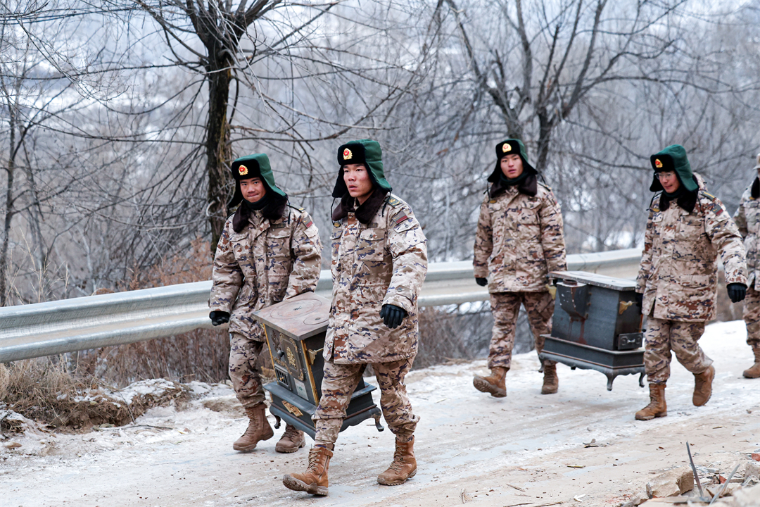 圖為12月19日,武警甘肅總隊(duì)臨夏支隊(duì)官兵正在搬運(yùn)取暖爐。