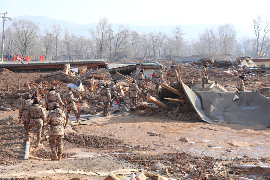 圖為12月20日,武警青??傟?duì)機(jī)動(dòng)一支隊(duì)官兵在青海省海東市民和縣中川鄉(xiāng)草灘村泥石流現(xiàn)場(chǎng)進(jìn)行搜救。羅元?jiǎng)P 攝