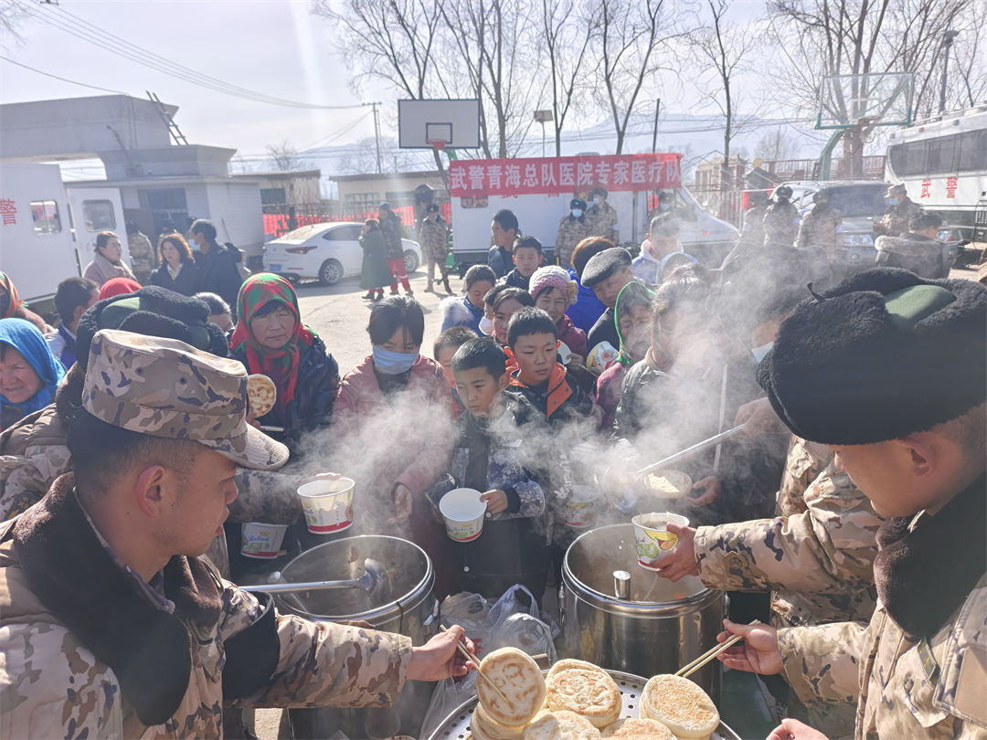 圖為12月20日,武警青??傟?duì)官兵在青海省海東市民和縣中川鄉(xiāng)草灘村安置點(diǎn)為群眾分發(fā)熱食。李少平 攝