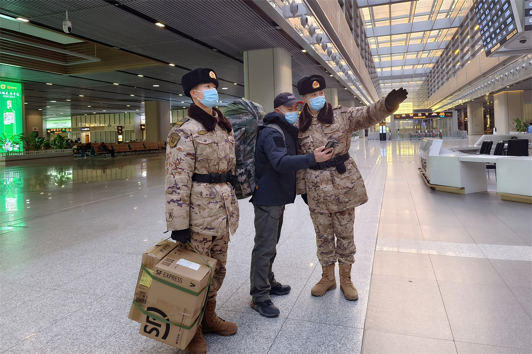 圖為執(zhí)勤武警正在為旅客指路。