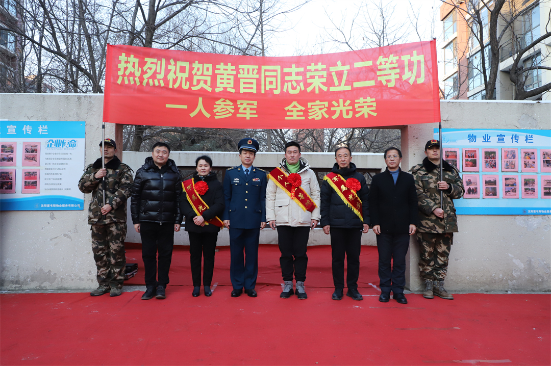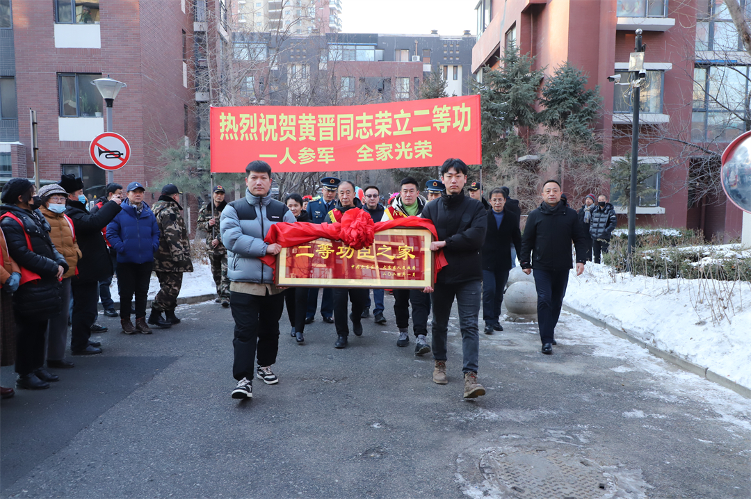 1月4日,遼寧省沈陽(yáng)市大東區(qū)東方歐博城小區(qū)內(nèi)鑼鼓喧天、人頭攢動(dòng)。沈陽(yáng)市大東區(qū)退役軍人事務(wù)局聯(lián)合大東區(qū)人武部和中國(guó)人民解放軍某部一起,為榮立二等功的黃晉送來(lái)立功喜報(bào)和“二等功臣之家”牌匾。