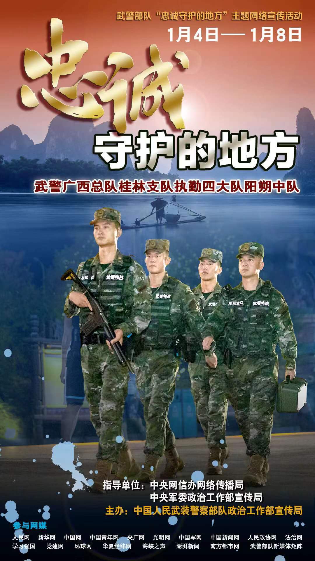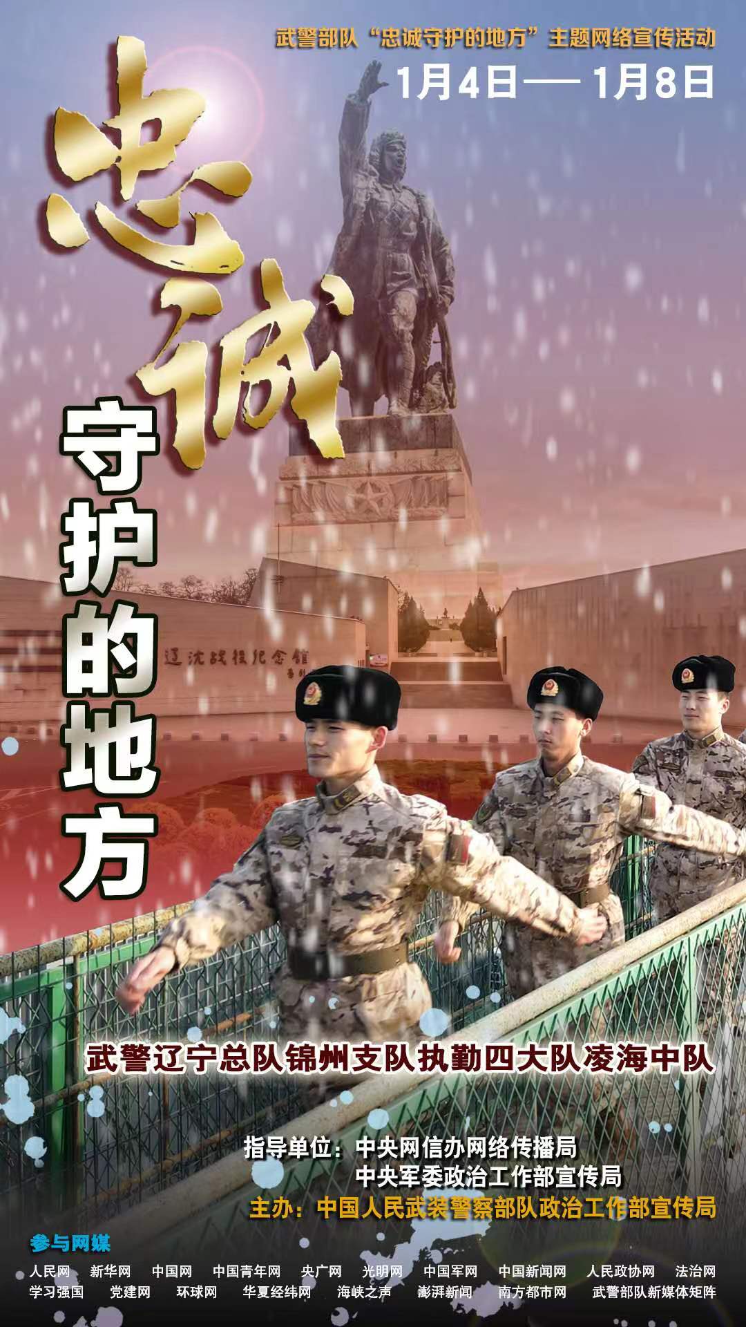 據(jù)悉,此次活動(dòng)已完成前期采訪,網(wǎng)上宣傳于1月4日啟動(dòng),將持續(xù)至1月8日,屆時(shí)人民網(wǎng)、新華網(wǎng)、中國(guó)軍網(wǎng)等多家主流網(wǎng)媒,每日以圖文、視頻等形式依次對(duì)受訪單位展開報(bào)道,武警部隊(duì)新媒體矩陣同步跟進(jìn)推送。
