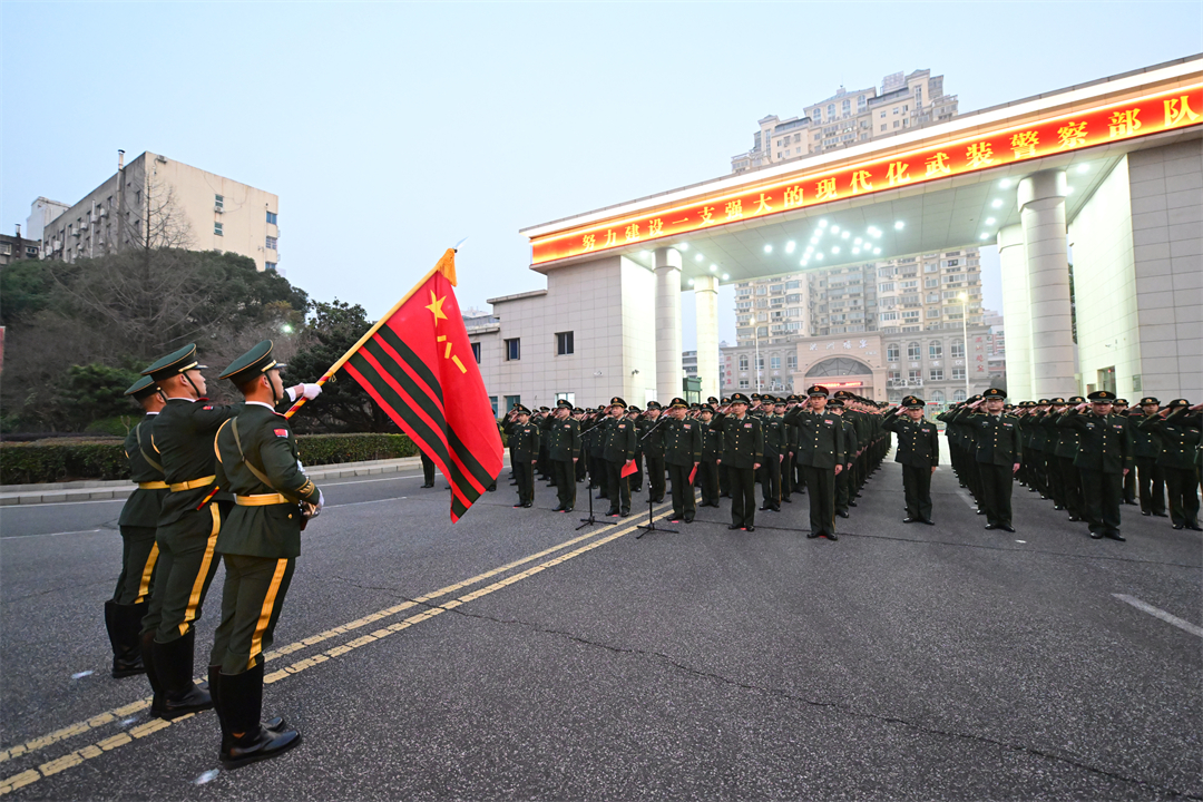 圖為武警江西總隊在機關(guān)營區(qū)舉行“升國旗、迎戰(zhàn)旗、學訓詞”活動。何宗卯 許書燦 攝
