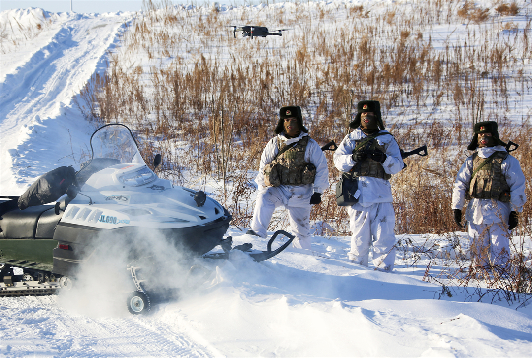 圖為陸軍某邊防旅“東方第一哨”官兵利用無(wú)人機(jī)巡邏執(zhí)勤。