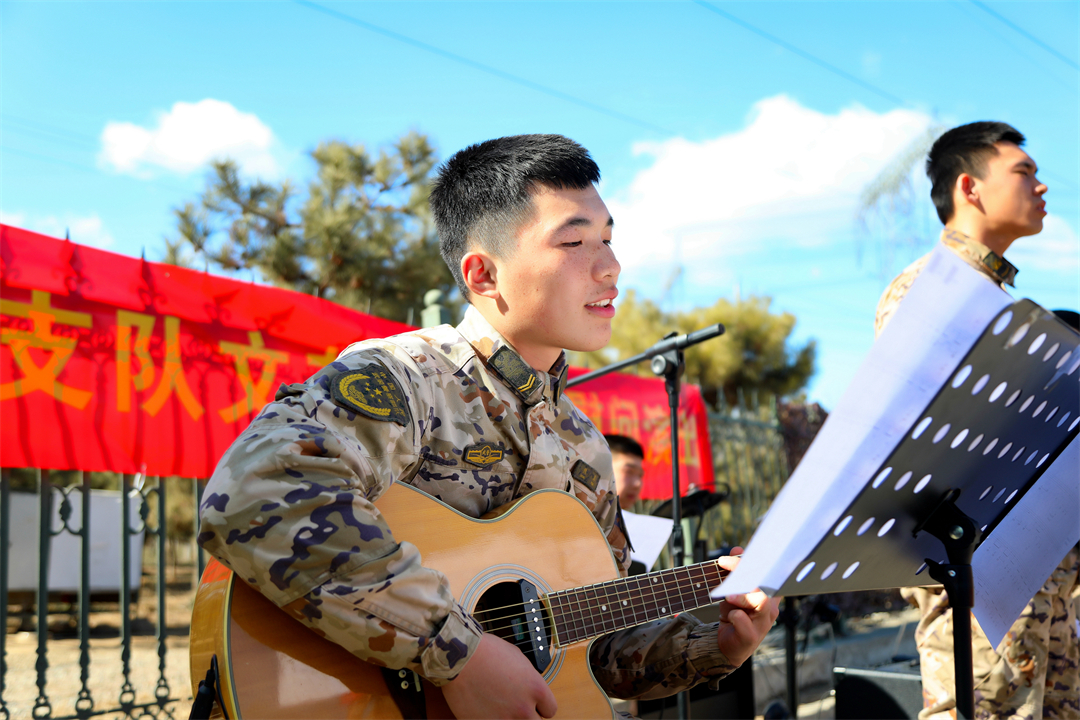 圖為文藝小分隊(duì)來(lái)到任務(wù)一線慰問(wèn)表演。