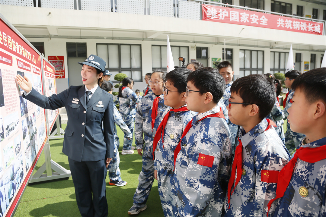 圖為2023年4月7日,南京警備區(qū)進(jìn)校園開展國(guó)防教育,文職人員給小學(xué)生介紹國(guó)防知識(shí)。張永祥 攝