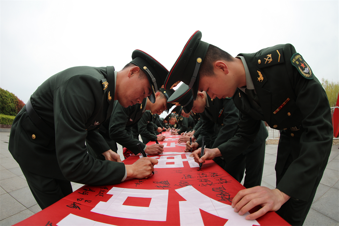 圖為3月28日,陸軍第71集團(tuán)軍“臨汾旅”組織官兵代表在“緬懷革命先烈 奮進(jìn)擔(dān)當(dāng)使命”橫幅上簽字。萬(wàn)里想 攝