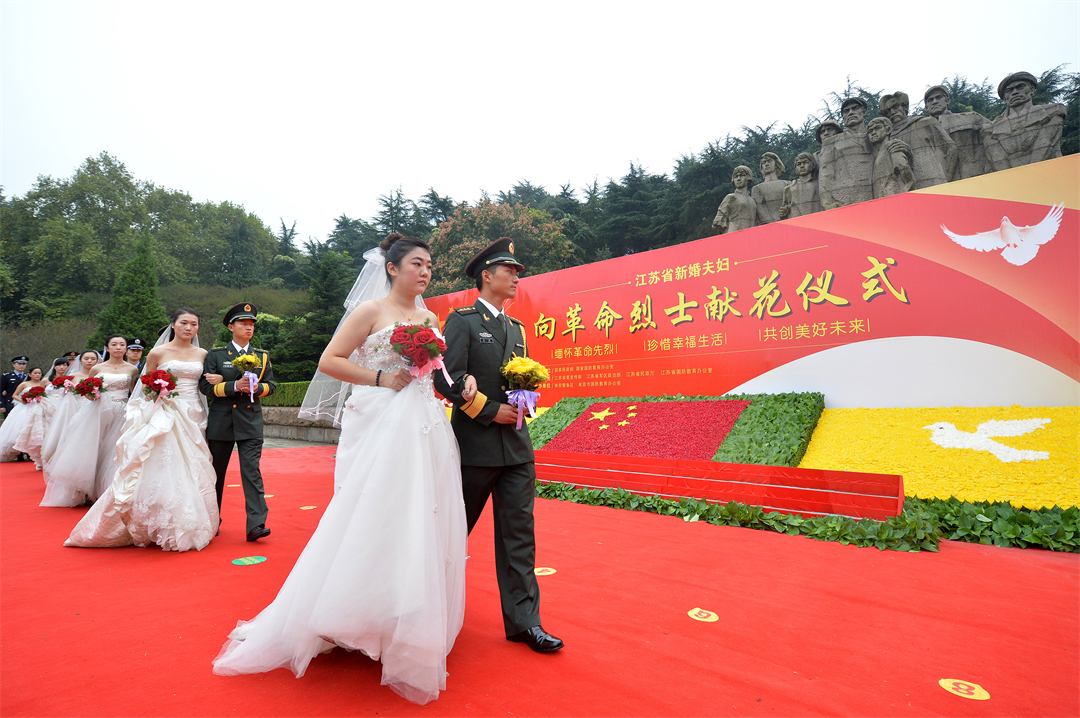 圖為駐寧某部干部劉洋(右一)和妻子劉芮(右二)參加新婚夫婦向革命烈士獻(xiàn)花時(shí)的場(chǎng)景。肖剛 攝
