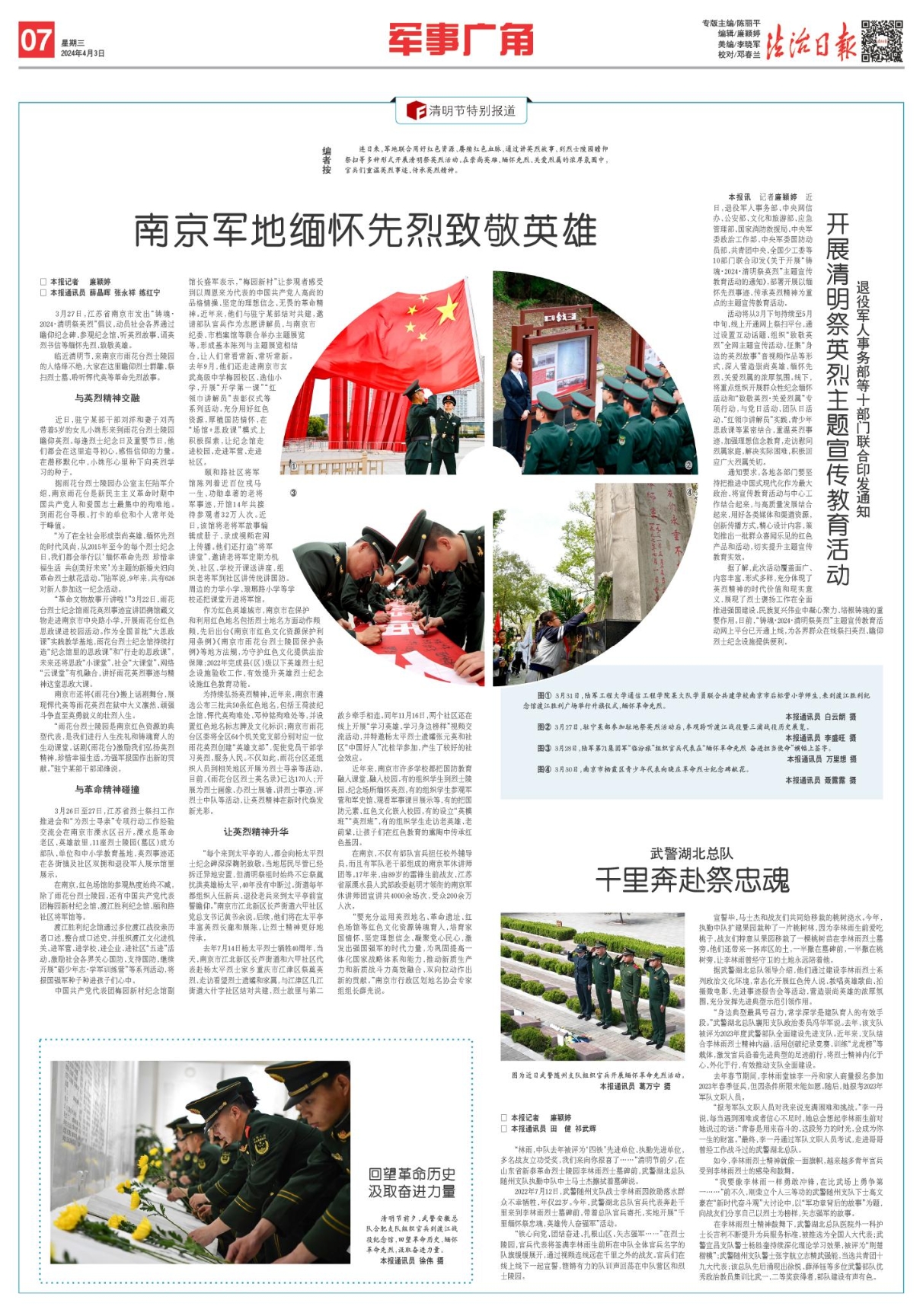 3月27日,江蘇省南京市發(fā)出“鑄魂·2024·清明祭英烈”倡議,動(dòng)員社會(huì)各界通過瞻仰紀(jì)念碑、參觀紀(jì)念館、聽英烈故事、誦英烈書信等緬懷先烈、致敬英雄。