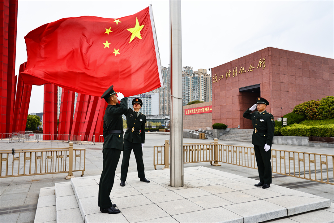 圖為3月31日,陸軍工程大學(xué)通信工程學(xué)院某大隊(duì)學(xué)員聯(lián)合共建學(xué)校南京市后標(biāo)營(yíng)小學(xué)師生,來(lái)到渡江勝利紀(jì)念館渡江勝利廣場(chǎng)舉行升旗儀式,緬懷革命先烈。白云朗 攝