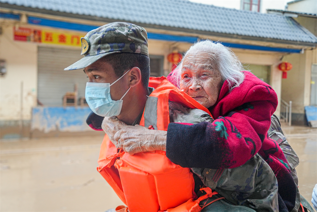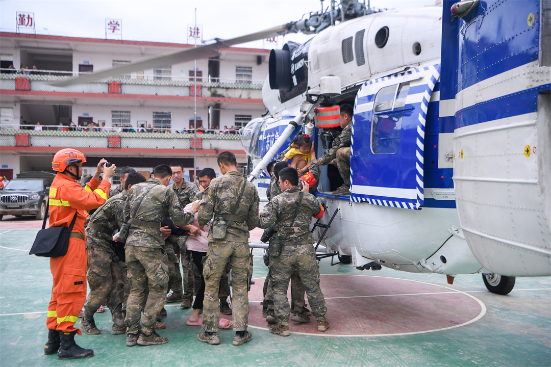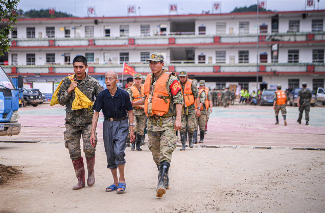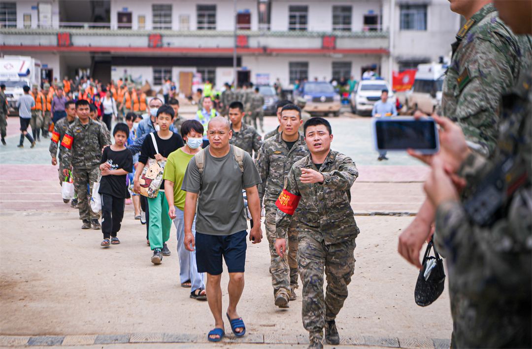 “凌晨6點(diǎn)天還沒(méi)亮,所有官兵就帶上干糧出發(fā)到各個(gè)村去疏散群眾?!睏钪艺f(shuō),江灣鎮(zhèn)下屬6個(gè)行政村有大大小小43個(gè)自然村,除情況最嚴(yán)重的梁屋村派出60人外,鍋溪村、圍坪村、江灣中心小學(xué)各派出30名兵力,胡屋村派出40名兵力,劃分若干個(gè)小組,聯(lián)合地方救援人員,按照先遣勘察、重裝開道、輕裝跟進(jìn)、觀察警戒的方式,逐村逐戶搜索勸離,剩余人員就在江灣中學(xué)和江灣鎮(zhèn)政府協(xié)助轉(zhuǎn)運(yùn)群眾。