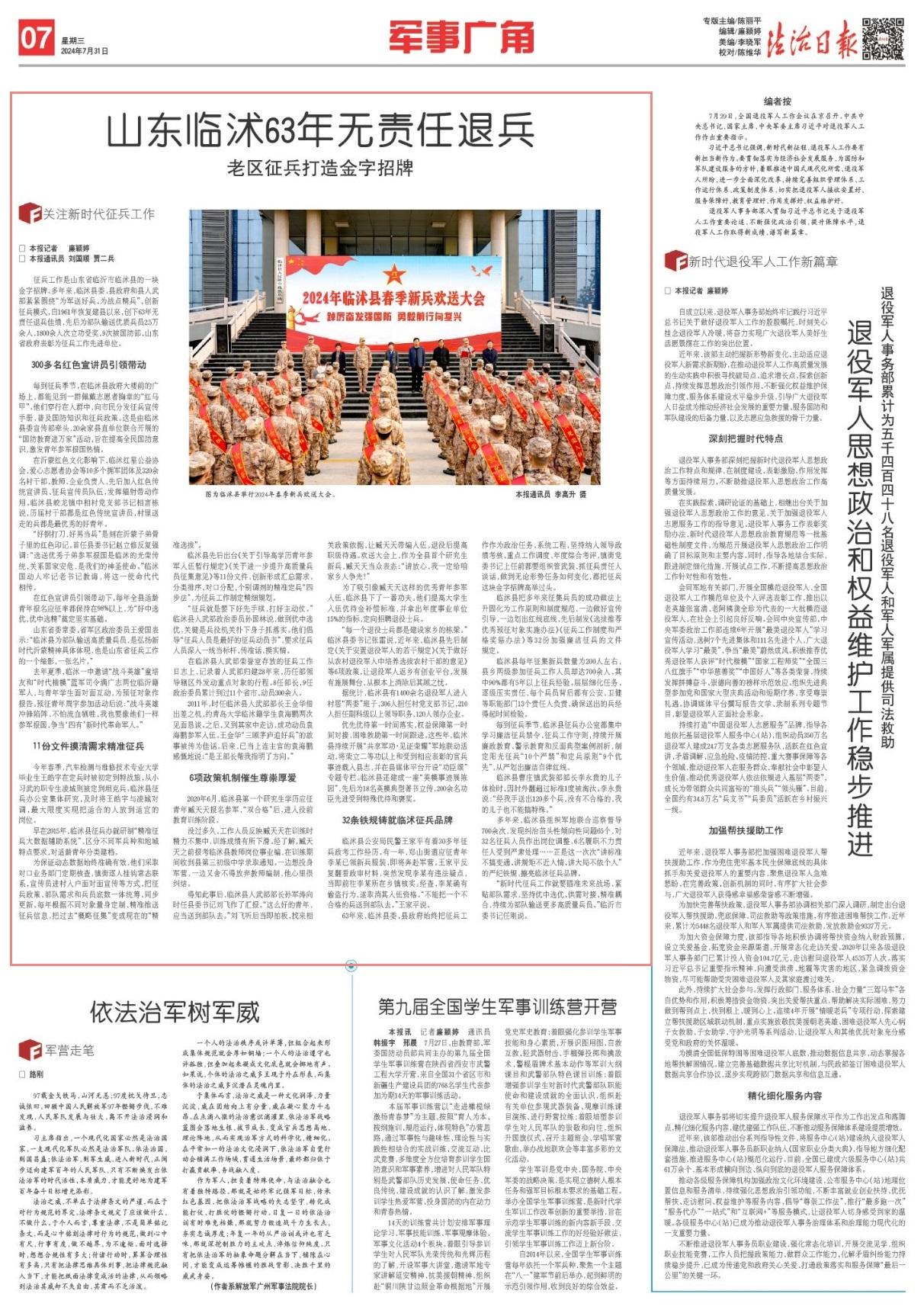 優(yōu)先優(yōu)待第一時(shí)間落實(shí),權(quán)益保障第一時(shí)間對(duì)接,困難救助第一時(shí)間跟進(jìn)。這些年,臨沭縣持續(xù)開(kāi)展“共享軍功·見(jiàn)證榮耀”軍地聯(lián)動(dòng)活動(dòng),將榮立二等功以上和受到相應(yīng)表彰的官兵事跡載入縣志,并在縣媒體平臺(tái)開(kāi)設(shè)“功臣頌”專題專欄。臨沭縣還建成一座“英模事跡展陳園”,先后為18名英模典型著書立傳,200余名功臣先進(jìn)受到特殊優(yōu)待和褒獎(jiǎng)。