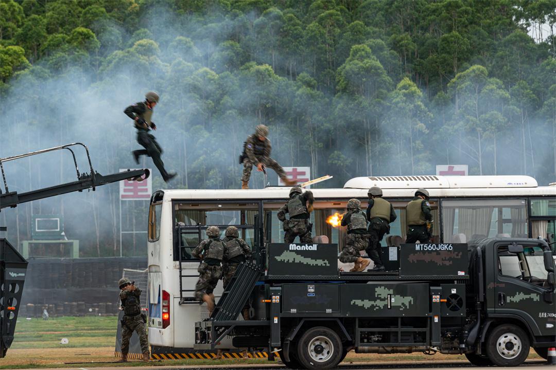 在聯(lián)合指揮所,雙方基于三維電子沙盤、綜合態(tài)勢(shì)感知等系統(tǒng)平臺(tái)展開指揮訓(xùn)練,現(xiàn)場(chǎng)可見熒光閃爍、指令頻傳。在技能訓(xùn)練場(chǎng),圍繞多種武器實(shí)彈射擊、無人機(jī)操作使用、攀登越障、搏擊格斗、戰(zhàn)場(chǎng)救護(hù)、搜排爆等實(shí)戰(zhàn)技能從嚴(yán)施訓(xùn)、梯次展開。在水上訓(xùn)練場(chǎng),雙方隊(duì)員或武裝泅渡、或奮楫操舟、或潛水突擊,猶如水上蛟龍。在戰(zhàn)術(shù)訓(xùn)練場(chǎng),創(chuàng)新運(yùn)用VR、MR、痛球、激光模擬等對(duì)抗手段,瞄準(zhǔn)未來戰(zhàn)場(chǎng),融合構(gòu)建虛擬現(xiàn)實(shí)、模擬仿真對(duì)抗訓(xùn)練場(chǎng)景。在綜合訓(xùn)練場(chǎng),交通工具反劫持和樓房清剿戰(zhàn)斗相繼打響,機(jī)器狗、仿生機(jī)器鳥、爬墻機(jī)器人等無人裝備紛紛亮相,聯(lián)合突擊組利用反恐突擊車、全地形車、直升機(jī)進(jìn)行立體投送,聯(lián)合機(jī)動(dòng)組轉(zhuǎn)移“傷員”,聯(lián)合排爆組標(biāo)識(shí)爆炸點(diǎn)位,成功完成課目演練。在野外演訓(xùn)場(chǎng),精干編成指揮機(jī)構(gòu),混合編組雙方隊(duì)員,成立聯(lián)合特戰(zhàn)隊(duì)追剿“恐怖分子”,在陌生復(fù)雜環(huán)境中檢驗(yàn)聯(lián)訓(xùn)成果,加速雙方聯(lián)合反恐實(shí)戰(zhàn)能力提升。其間,雙方還舉行了體育比賽、文藝演出等活動(dòng)。