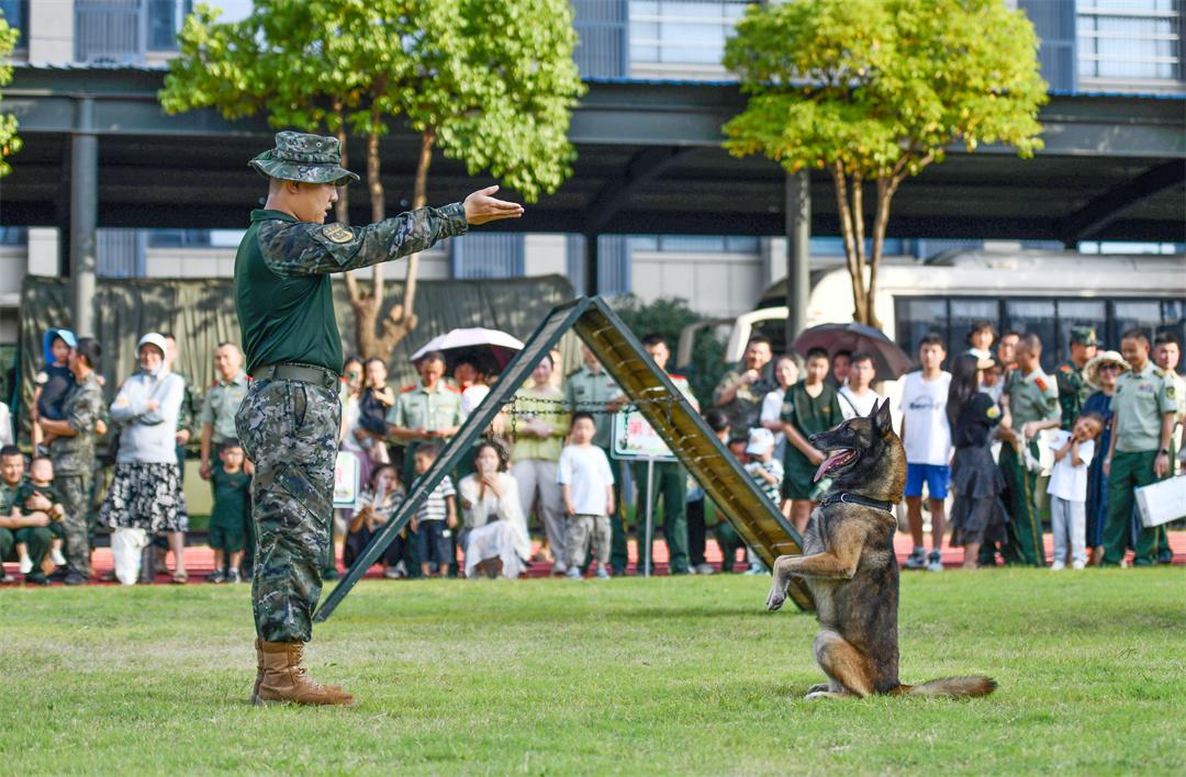 圖為軍嫂軍娃在武警合肥支隊營區(qū)觀摩軍犬服從訓(xùn)練演示。