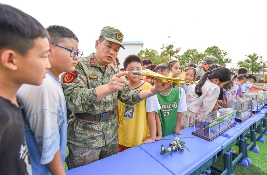 圖為合肥市廬陽區(qū)民兵向?qū)W生介紹武器裝備性能。
