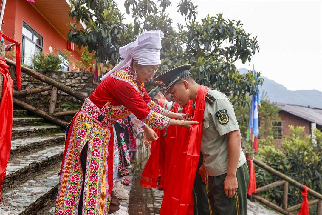 圖為北川羌族人民為武警官兵獻上羌紅。