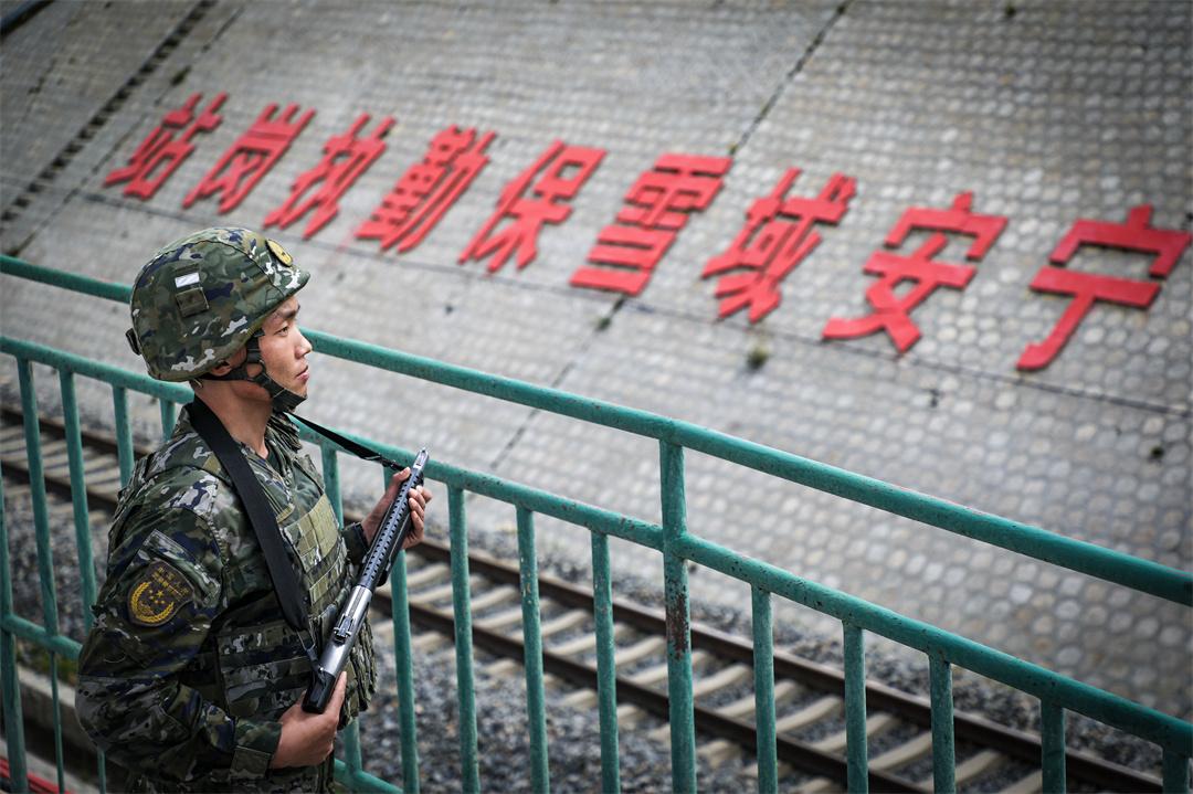 圖為武警官兵進(jìn)行護(hù)路演練。