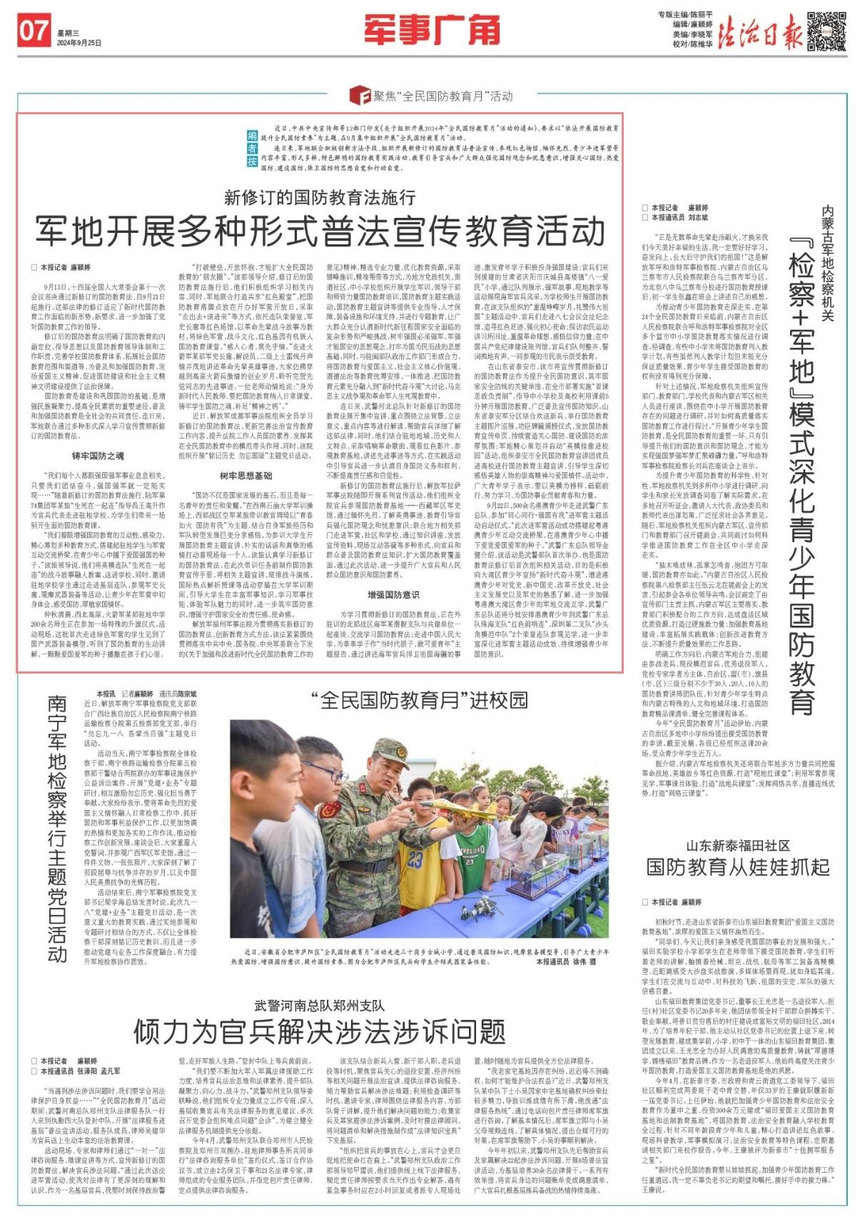 連日來,軍地聯(lián)合積極創(chuàng)新方法手段,組織開展新修訂的國防教育法普法宣傳、參觀紅色場館、緬懷先烈、青少年進(jìn)軍營等內(nèi)容豐富、形式多樣、特色鮮明的國防教育實(shí)踐活動,教育引導(dǎo)官兵和廣大群眾強(qiáng)化國防觀念和憂患意識,增強(qiáng)關(guān)心國防、熱愛國防、建設(shè)國防、保衛(wèi)國防的思想自覺和行動自覺。