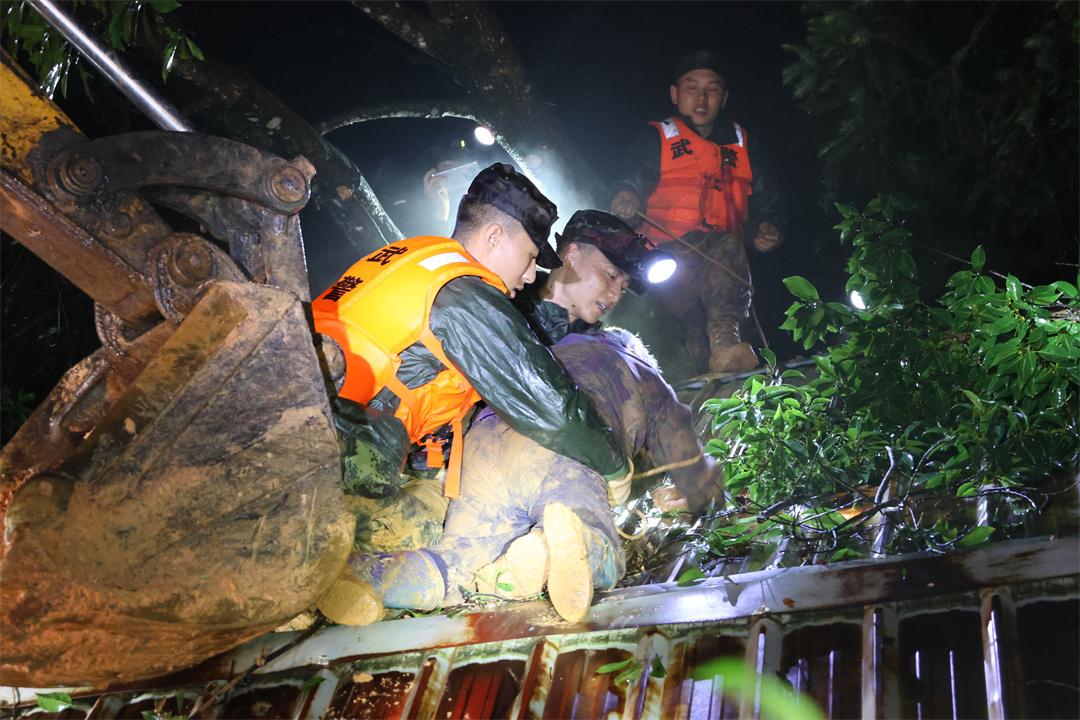 今年6月,受持續(xù)強(qiáng)降雨影響,上杭縣多地發(fā)生山體滑坡、內(nèi)澇等災(zāi)情。上杭中隊接到當(dāng)?shù)卣仍埱蠛螅嘘犻L周徐聰立即帶領(lǐng)11名官兵挺進(jìn)受災(zāi)嚴(yán)重的上杭縣中都鎮(zhèn)。得知一處倒塌房屋內(nèi)埋著兩名老人,指揮員在確定老人位置后,迅速判定情況,指揮救援。