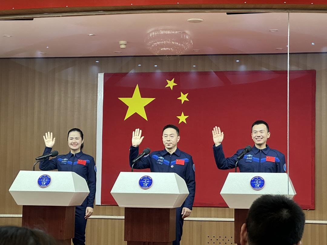 10時,蔡旭哲、宋令東、王浩澤3名乘組航天員在酒泉衛(wèi)星發(fā)射中心問天閣與中外媒體記者集體見面。