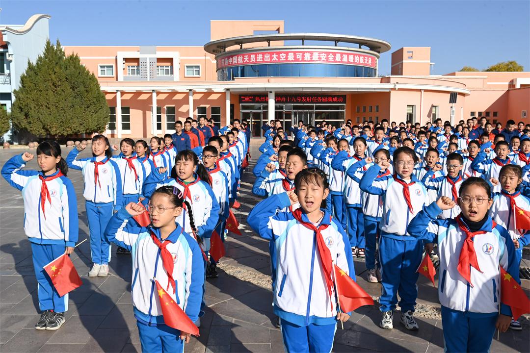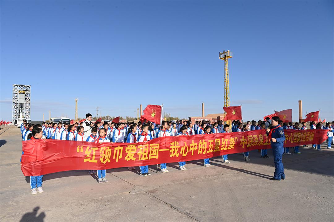 隨后,少先隊(duì)員們帶著國(guó)旗前往載人航天發(fā)射場(chǎng)。神舟十九號(hào)載人飛船發(fā)射任務(wù)0號(hào)指揮員趙磊為少先隊(duì)員們介紹了這座我國(guó)目前唯一的載人航天發(fā)射塔架。就在前幾天,神舟十九號(hào)航天員乘組從這里飛向中國(guó)空間站。截至目前,這里發(fā)射了19艘神舟飛船,將24名38人次航天員送入太空。這面滿載榮譽(yù)的國(guó)旗正是從這個(gè)塔架上隨航天員一同進(jìn)入中國(guó)空間站。